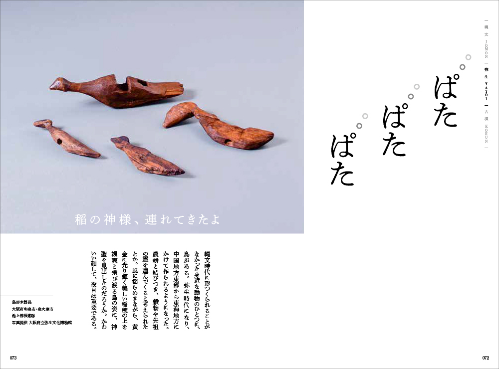 「人々が文字を使い、自分の気持ちを現すことができなかった時代だからこそ、ものに対して純粋にエネルギーを掛けることができたのかもしれないし、文字で残っていないからこそ、 私たちは彼らが作ったものに対して、心の赴くままに鑑賞し、感じ、受け入れることができるのかもしれない。」 と著者が述べているように、この書籍では、歴史的な内容に加え、人々の生活を想像させるような著者の解説と一緒に、土器や土偶、石器、装飾品など様々なものが紹介されています。
